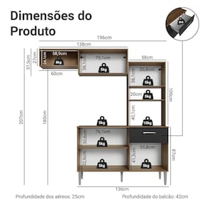- 25 cm de profundidade nos aéreos e 42 cm nos balcões