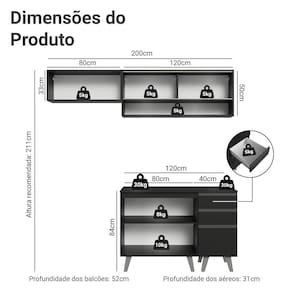 - 52 cm de profundidade nos balcões e 31 cm nos aéreos