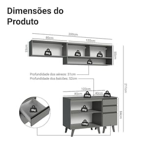 52 cm de profundidade nos balcões e 31 cm nos aéreos