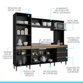 Características da cozinha: Produzida em MDP de 15 mm com acabamento UV na cor preto texturizado, detalhe travessa Flex nas cores preto e avelã, portas com dobradiças metálicas, gavetas com corrediças telescópicas, puxadores perfil em ABS bronze, pés reguláveis em ABS bronze