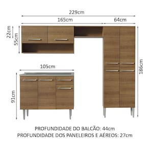 - 44 cm de profundidade no balcão e 27 cm de profundidade no aéreo e no paneleiro
