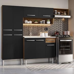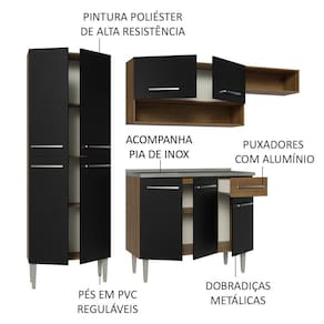 Qualidade duradoura e ótimo custo-benefício: A cozinha é fabricada com materiais de alta qualidade, garantindo uma longa vida útil. Possui corrediças e dobradiças metálicas, puxadores com alumínio e pés ajustáveis em PVC, características que asseguram maior resistência e durabilidade.