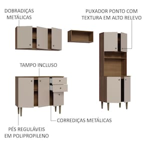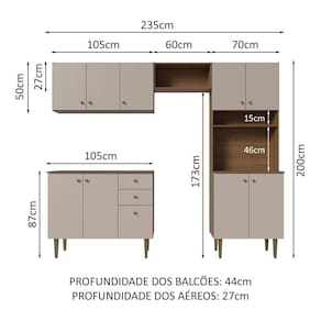 Medidas totais: 200 cm de altura x 235 cm de largura x 44 cm de profundidade nos balcões e 27 cm nos aéreos.
