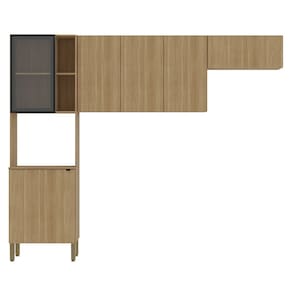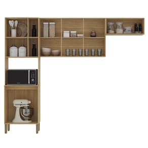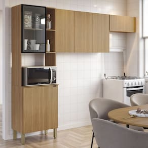 O Armário Aéreo possui três portas convencionais, enquanto o Armário de Geladeira apresenta uma porta basculante, todas passantes, dispensando o uso de puxadores, o que dá à composição um visual contemporâneo. Com quatro prateleiras internas, o Armário oferece amplo espaço de armazenamento, ideal para eletrodomésticos, utensílios, louças e mantimentos.