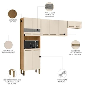 É fabricado em MDF de 12mm com acabamento em pintura UV, oferecendo máxima resistência. As dobradiças metálicas proporcionam uma abertura suave, enquanto os puxadores ergonômicos em poliestireno tornam o uso mais prático e confortável. A textura em cristalo na frente das portas confere um toque de sofisticação e destaque que eleva a beleza do ambiente. Os pés em plástico resistente de polipropileno são reguláveis, o que permite ajustar pequenos desníveis de piso e manter a estabilidade do Armário de Cozinha.