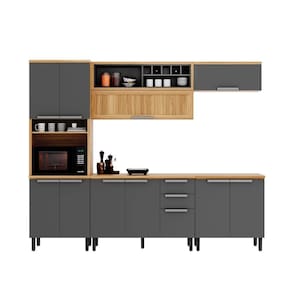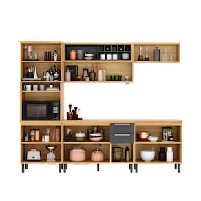 Um paneleiro com uma porta e espaço para forno ou micro-ondas de até 70cm de largura, ideal para integrar eletrodomésticos ao projeto de forma prática.Um armário aéreo de 120cm com uma porta horizontal e nicho aberto, oferecendo fácil acesso a itens do dia a dia.Dois balcões, um de 120cm com uma porta horizontal e nicho e um de 80cm com duas portas. Ambos com tampo em BP resistente a altas temperaturas (até 120C).Um armário aéreo adicional de 80cm com duas portas que amplia ainda mais a capacidade de organização.
