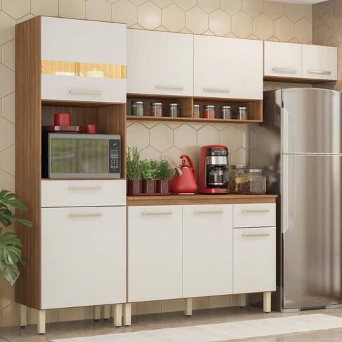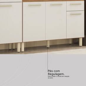 A Cozinha Compacta Laos oferece design atemporal e combinações de cores elegantes, criando um ponto de destaque na sua cozinha. Com paneleiro para micro-ondas, armários aéreos e um balcão para organizar utensílios e eletroportáteis, ela otimiza o armazenamento. A ampla bancada é perfeita para o preparo de alimentos ou para montar um cantinho do café. Equipado com pés reguláveis, garante nivelamento e proteção contra a umidade, aumentando a durabilidade.