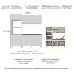 Dimensões do produto montado: Cozinha - Altura: 203cm | Largura: 182cm | Profundidade: 32cm (aéreo) - 53cm (paneleiro e balcão com tampo) *Você pode consultar as medidas internas na imagem técnica do produto.