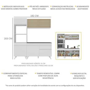Dimensões do produto montado: Cozinha - Altura: 203cm | Largura: 182cm | Profundidade: 31cm (aéreo) - 53cm (paneleiro e balcão com tampo) *Você pode consultar as medidas internas na imagem técnica do produto.