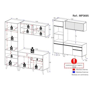 Conteúdo da Embalagem: 1 (um) armário aéreo com portas de vidro 120cm 1 (um) balcão com tampo 120cm 1 (um) armário para forno e microondas 62cm