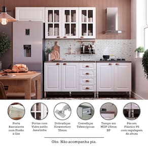 A Cozinha Safira traz design e sofisticação, a combinação perfeita entre beleza e funcionalidade. Desenvolvida em MDP, o que garante qualidade e durabilidade. E o estilo Provençal, que o queridinho do momento! Conta puxadores Bronze e pés com regulagem de altura no acabamento PS Cromado.
