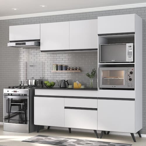 A Cozinha Compacta 4 peças com Armário e Balcão MP3690 Veneza Multimóveis tem um excelente custo benefício e um amplo espaço interno. Produzida em MDP com acabamento acetinado (cerca de 20% de brilho), que garante maior durabilidade e resistência, possui corrediças metálicas (mais leveza no manuseio), pés retrô em polipropileno, que deixam o ambiente mais estiloso, puxadores em ABS e tampo em MDP 15mm com pintura de alta resistência. Os módulos são individuais e você pode montar da maneira que se adaptar melhor ao seu ambiente. O balcão possui tampo removível (compatível com pia de 120 cm). Para deixar sua cozinha mais bonita e organizada, possui módulo para forno e microondas, além de compartimento especial para utensílios mais altos.