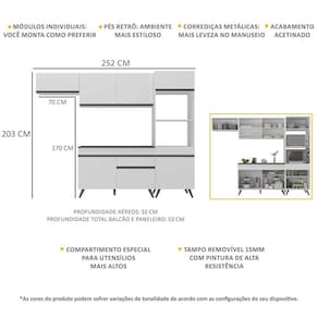 Dimensões do produto montado: Cozinha - Altura: 203cm | Largura: 252cm | Profundidade: 32cm (aéreos) - 53cm (paneleiro e balcão com tampo) Espaço para fogão/geladeira - Altura: 170cm | Largura: 70cm *Você pode consultar as medidas internas na imagem técnica do produto.