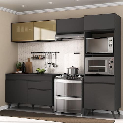 Conteúdo da Embalagem: 1 (um) armário aéreo 70cm 1 (um) armário aéreo com portas de vidro 120cm 1 (um) balcão com tampo 120cm 1 (um) armário para forno e microondas 62cm