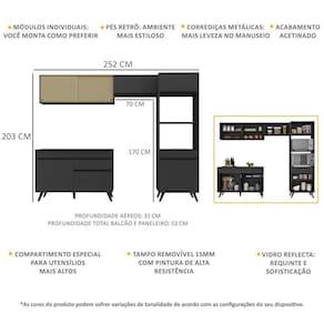 Dimensões do produto montado: Cozinha - Altura: 203cm | Largura: 252cm | Profundidade: 31cm (aéreos) - 53cm (paneleiro e balcão com tampo) Espaço para fogão/geladeira - Altura: 170cm | Largura: 70cm *Você pode consultar as medidas internas na imagem técnica do produto.