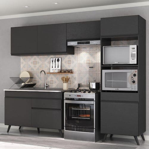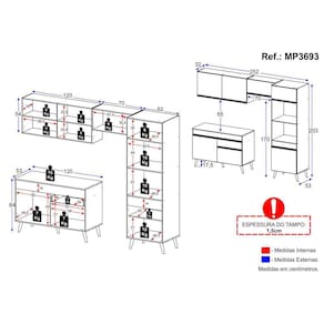 Conteúdo da Embalagem: 1 (um) armário aéreo 70cm 1 (um) armário aéreo 120cm 1 (um) balcão com tampo 120cm 1 (um) armário para forno e microondas 62cm