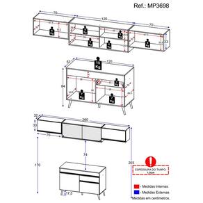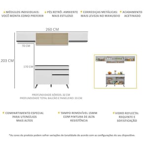 Dimensões do produto montado: Cozinha - Altura: 203cm | Largura: 260cm | Profundidade: 32cm (aéreos) - 53cm (balcão com tampo) Espaço para fogão/geladeira - Altura: 170cm | Largura: 70cm *Você pode consultar as medidas internas na imagem técnica do produto.