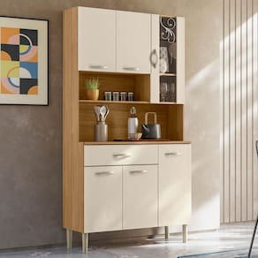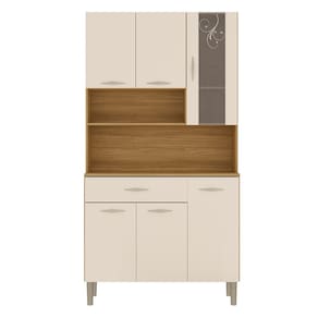 Com seis portas, sendo uma delas com vidro incolor e detalhe serigrafado, este Armário combina praticidade e beleza. Ele também inclui uma gaveta, ideal para a disposição de talheres ou outros itens de sua preferência. O Nicho na parte superior é perfeito para expor objetos decorativos e temperos, trazendo leveza ao Armário de Cozinha Simples e contribuindo para uma decoração charmosa. A textura cristalo na frente das portas e gaveta confere um design moderno que se destaca no ambiente.