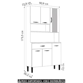 É fabricado em MDF de 12mm com acabamento em pintura UV, garantindo alta qualidade e resistência para a Cozinha Compacta. As dobradiças e corrediças metálicas proporcionam uma abertura e fechamento suave, enquanto os puxadores ergonômicos em poliestireno tornam o uso ainda mais prático e confortável. Com uma prateleira interna, possui espaço para organizar utensílios, louças e eletrodomésticos. Os pés fixos em plástico resistente de polipropileno, asseguram a sustentação e estabilidade do Armário de Cozinha.