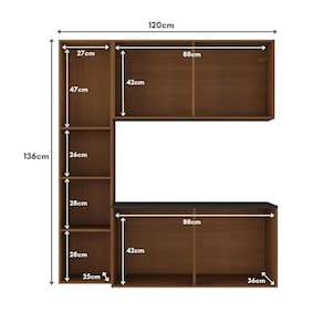 Dimensões do produto montado: Altura: 136cm | Largura: 120cm | Profundidade: 38cm (Balcão) - 25cm (Armário Aéreo) *Você pode consultar as medidas detalhadas na imagem técnica do produto.