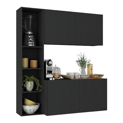 Armário De Cozinha Compacta Com Balcão Linea Fit 4 Portas Multimóveis Mp2218 Preto Preto O Armário de Cozinha Compacta com Balcão Linea Fit 4 Portas Multimóveis MP2218 é a solução ideal para otimizar o espaço da sua cozinha. Produzido em MDP com acabamento acetinado (cerca de 20% de brilho), que confere durabilidade e resistência, possui 4 portas com dobradiças metálicas e amplo espaço interno, nichos (suportam até 3kg) para acomodar os itens mais utilizados no dia a dia e espaço para colocação de utensílios mais altos. O design moderno e elegante das portas passantes dispensa a utilização de puxadores. Além disso, o balcão acompanha tampo de 15mm que suporta até 12kg, ótimo para acomodar objetos de cozinha ou servir de apoio na hora de preparar suas receitas. Suspensa, esta cozinha permite a sua montagem na altura desejada, além de facilitar a limpeza do ambiente. O balcão NÃO é indicado para utilização de pia. Conteúdo da Embalagem: 1 (uma) Cozinha Manual de Montagem Kit Ferragem