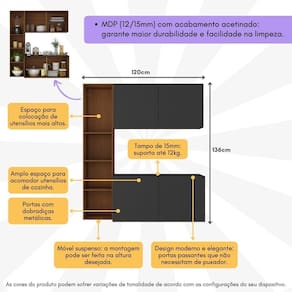 Dimensões do produto montado: Altura: 136cm | Largura: 120cm | Profundidade: 38cm (Balcão) - 25cm (Armário Aéreo) *Você pode consultar as medidas detalhadas na imagem técnica do produto.
