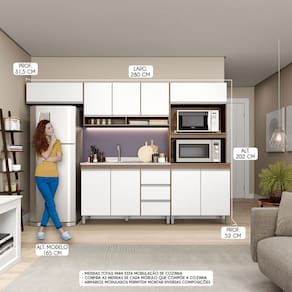 Características da cozinha Produzida em MDP de 15 mm com acabamento UV nas cores branco e avelã, portas com dobradiças metálicas e porta basculante com pistão a gás. Gavetas com corrediça telescópica, puxadores perfil em ABS na cor prata e pés com regulagem na mesma tonalidade. Nicho superior para forno com 40 cm de altura, 77 cm de largura e 50,5 cm de profundidade. Nicho inferior para micro-ondas com 35 cm de altura, 77 cm de largura e 50,5 cm de profundidade. Balcão para pia com 120 cm de largura e 52 cm de profundidade, não acompanha tampo nem pia.