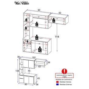 Dimensões do produto montado: Altura: 138cm | Largura: 152cm | Profundidade: 30cm (aéreos) - 38cm (balcão com tampo) Espaço para fogão/geladeira - Altura: ajustável - Largura: 62cm *Você pode consultar as medidas internas na imagem técnica do produto.