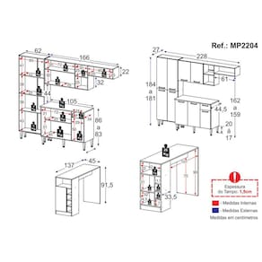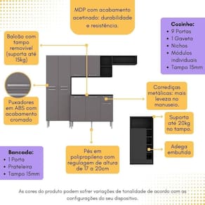 O Armário de Cozinha Compacta com Bancada Americana Pequim Multimóveis MP2204 é a solução ideal para quem busca sofisticação e funcionalidade na área gastronômica. Produzido em MDP com acabamento acetinado (cerca de 20% de brilho), garante durabilidade e facilidade na limpeza. Com 9 portas, nichos, 1 gaveta com corrediças metálicas (mais leveza no manuseio), além de compartimento especial para utensílios mais altos, esta cozinha proporciona amplo espaço para organizar todos os utensílios culinários. Os pés em polipropileno, com regulagem de altura de 17 a 20cm, oferecem um perfeito nivelamento dos módulos, enquanto os puxadores em ABS com acabamento cromado adicionam um toque moderno ao design. Os módulos são individuais (exceto o nicho para fogão/geladeira que é anexo ao armário aéreo), permitindo a montagem de acordo com a disposição do espaço. Os tampos de 15mm do balcão (suporta até 15kg) e da bancada (suporta até 20kg) são resistentes. O tampo do balcão é removível (compatível apenas com pia sob medida). A bancada inclusa conta com 1 porta, prateleira interna e adega embutida, oferecendo espaço adicional para armazenamento e praticidade na hora de servir bebidas, além de poder ser utilizada como divisora de ambientes.