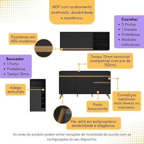 Conteúdo da Embalagem: 1 (um) Armário Aéreo 150cm 1 (um) Balcão com Tampo 150cm 1 (uma) Bancada/Mesa Manual de Montagem Kit Ferragem