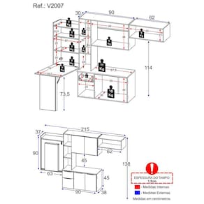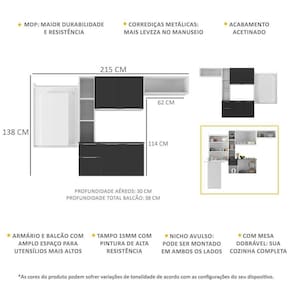 Mesa Dobrável (aberta) - Altura: 163,5cm | Largura: 63cm | Profundidade: 107cmEspaço para fogão/geladeira - Altura: ajustável - Largura: 62cm