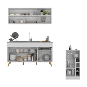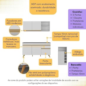 Conteúdo da Embalagem: 1 (um) Armário Aéreo 150cm 1 (um) Balcão com Tampo 150cm 1 (uma) Bancada/Mesa Manual de Montagem Kit Ferragem