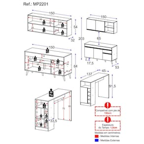 Dimensões do produto montado: Cozinha - Altura: 203cm | Largura: 150cm | Profundidade: 53cm Bancada/Mesa - Altura: 91,5cm | Largura: 137cm | Profundidade: 45cm *Você pode consultar as medidas detalhadas na imagem técnica do produto.