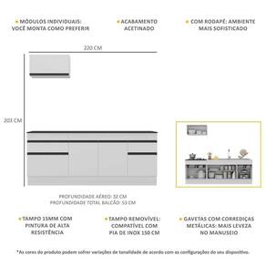 Dimensões do produto montado: Altura: 203cm | Largura: 220cm | Profundidade: 32cm (aéreo) - 53cm (balcão com tampo) *Você pode consultar as medidas internas na imagem técnica do produto. *As cores do produto podem sofrer variações de tonalidade de acordo com as configurações do seu dispositivo.