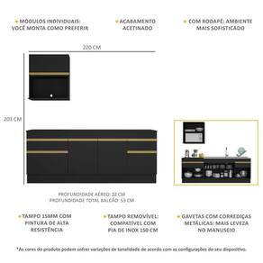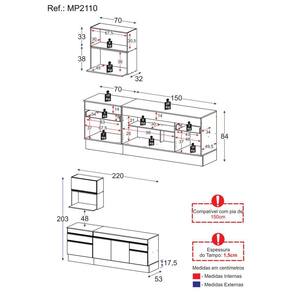 Altura: 203cm | Largura: 220cm | Profundidade: 32cm (aéreos) - 53cm (balcão com tampo)