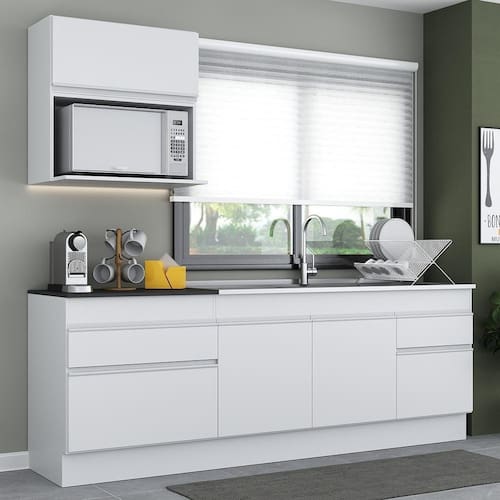 Conteúdo da Embalagem: 1 (um) armário aéreo 70cm 1 (um) módulo para microondas 1 (um) balcão com tampo 70cm 1 (um) balcão com tampo 150cm 1 (um) kit com rodapés
