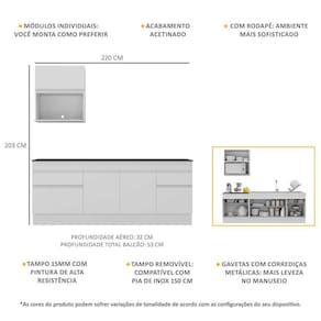 Dimensões do produto montado: Altura: 203cm | Largura: 220cm | Profundidade: 32cm (aéreos) - 53cm (balcão com tampo) *Você pode consultar as medidas internas na imagem técnica do produto. *As cores do produto podem sofrer variações de tonalidade de acordo com as configurações do seu dispositivo.