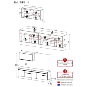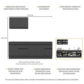 Dimensões do produto montado: Altura: 203cm | Largura: 270cm | Profundidade: 32cm (aéreos) - 53cm (balcão com tampo) *Você pode consultar as medidas internas na imagem técnica do produto. *As cores do produto podem sofrer variações de tonalidade de acordo com as configurações do seu dispositivo.