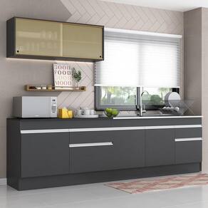 Conteúdo da Embalagem: 1 (um) armário aéreo com portas de vidro 120cm 1 (um) balcão com tampo 120cm 1 (um) balcão com tampo 150cm 1 (um) kit com rodapés