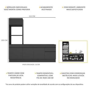 Dimensões do produto montado: Altura: 203cm | Largura: 212cm | Profundidade: 53cm (balcão com tampo e paneleiro) *Você pode consultar as medidas internas na imagem técnica do produto. *As cores do produto podem sofrer variações de tonalidade de acordo com as configurações do seu dispositivo.