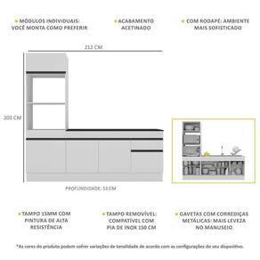 Dimensões do produto montado: Altura: 203cm | Largura: 212cm | Profundidade: 53cm (balcão com tampo e paneleiro) *Você pode consultar as medidas internas na imagem técnica do produto. *As cores do produto podem sofrer variações de tonalidade de acordo com as configurações do seu dispositivo.