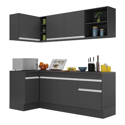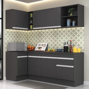 Conteúdo da Embalagem: 1 (um) armário aéreo de canto 90cm 1 (um) armário aéreo 150cm 1 (um) balcão com tampo de canto 90cm 1 (um) balcão com tampo 150cm 1 (um) kit com rodapés