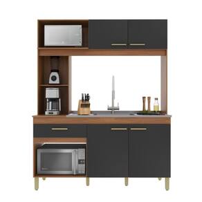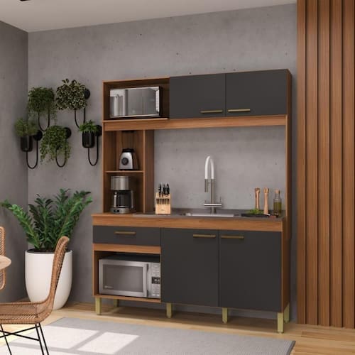 Sua estrutura é feita em MDP de 12mm na caixaria e 15mm nas portas e gaveta, oferecendo resistência e durabilidade. Os nichos multifuncionais permitem fácil acesso aos itens do dia a dia, e os espaços dedicados para micro-ondas e forno tornam o conjunto ainda mais prático.