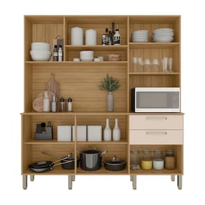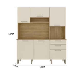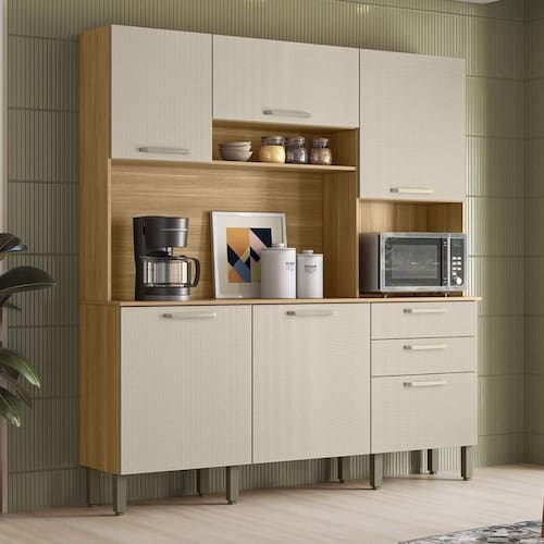 A cozinha Ferrara, além de trazer todo o conceito de amplitude e organização para o ambiente, conta com uma estrutura 100% em MDF, garantindo maior resistência e durabilidade. Seu design inteligente com amplas repartições e nichos facilita o armazenamento de objetos e itens diversos, enquanto o espaço dedicado ao forno ou micro-ondas agrega praticidade. O acabamento com pintura fosca e textura sensível ao toque não só valoriza o visual, mas também respeita o meio ambiente.