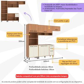 Dimensões do produto montado: Altura: 220cm | Largura: 255cm | Profundidade: 50cm (balcão) - 30cm (armários aéreos) Espaço para fogão/geladeira: Altura: 186cm | Largura: 70cm *Você pode consultar as medidas detalhadas na imagem técnica do produto.