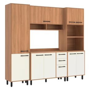 Conteúdo da Embalagem: 1 (um) Armário para Forno e Micro-Ondas 65cm 1 (um) Paneleiro 55cm 1 (um) Armário Aéreo 120cm 1 (um) Balcão com Tampo 120cm Manual de Montagem Kit Ferragem