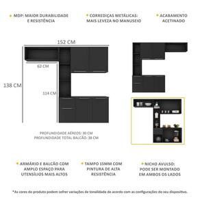 Dimensões do produto montado: Altura: 138cm | Largura: 152cm | Profundidade: 30cm (aéreos) - 38cm (balcão com tampo) Espaço para fogão/geladeira - Altura: ajustável - Largura: 62cm *Você pode consultar as medidas internas na imagem técnica do produto.