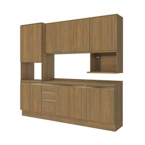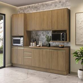 Completo e muito funcional, perfeito para todos os espaços, o combo une dois balcões, um de 60cm e o balcão de pia, além dos aéreos nas mesmas medidas, incluindo ainda o nicho para microondas e o kit forno, uma composição completa e muito versátil, indispensável para quem procura por funcionalidade. Acompanhados dos tampos, os balcões permitem ser montados com cuba ou pedra, oferecendo amplo espaço para organizar louças e mantimentos.