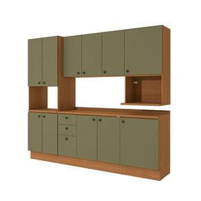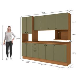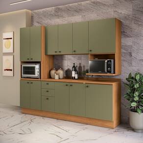 Já as frentes, na cor verde frevo, contam com acabamento fosco em BP, proporcionando maior durablidade contra riscos, arranhões e gotas d'água. Uma combinação aconchegante e moderna, remetendo aos tons da natureza e deixando seu ambiente lindo, incluindo facilidade durante a limpeza. Completo e muito funcional, são 2,20m de altura, 2,50m de largura e 52cm de profundidade, perfeito para todos os espaços, o combo une dois balcões, um de 60cm e o balcão de pia, além dos aéreos nas mesmas medidas, incluindo ainda o nicho para microondas e o kit forno, uma composição completa e muito versátil, indispensável para quem procura por funcionalidade.