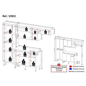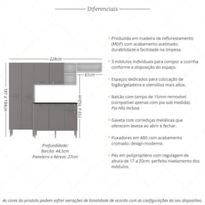 São 9 portas com puxadores em ABS com acabamento cromado, propiciando um toque moderno e amplo espaço de organização. Possui balcão com tampo (15mm) removível, compatível apenas com pia sob medida, possibilitando múltiplas maneiras de utilização. Para deixar sua cozinha mais bonita e organizada, conta com compartimento especial para utensílios mais altos e módulo aéreo com nichos versáteis.